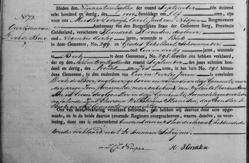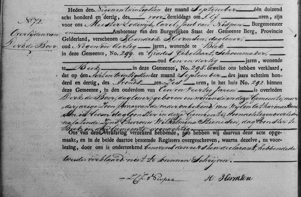 Overlijdensakte Derk Boers, 1830. Bron http://zoekakten.nl
