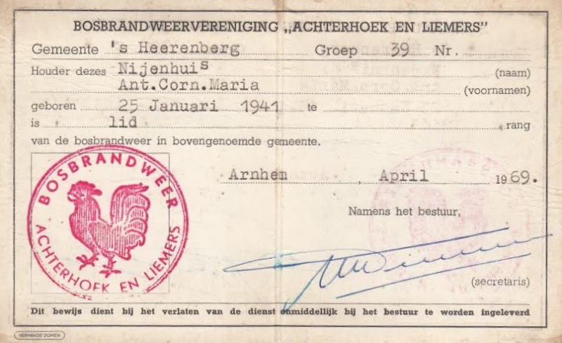 lidmaatschapskaart van de Bosbrandweervereninging "Achterhoek en Liemers"
