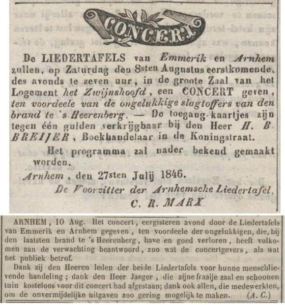 Advertentie in de Arnhemsche Courant van 4 augustus 1846 en een bericht in het Algemeen Handelsblad van 12 augustus 1846