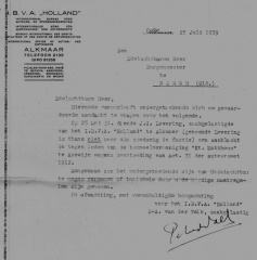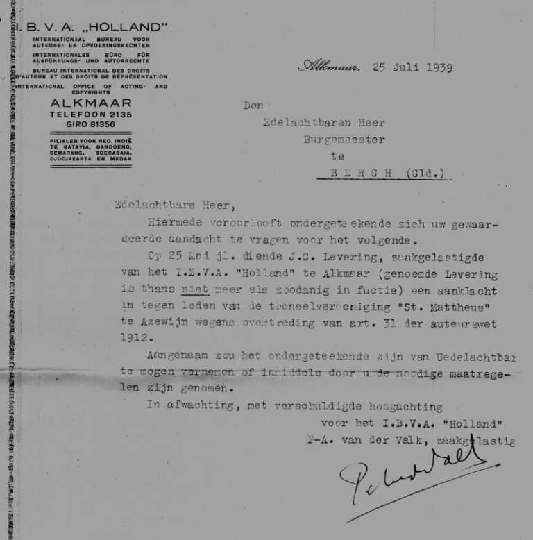 Brief van de IVBA aan de burgemeester van Bergh van 25 juli 1939 betreffende een aanklacht tegen de Azemse toneelvereniging St. Mattheus (later geheten Ons Genoegen)