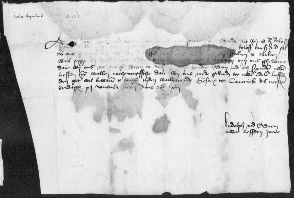 Brief_Ludolf en Adam_van den Bergh aan hun vader Willem II van den Bergh, geschreven op 3 augustus 1464 in Kamerijk / Cambrai, Noord-Frankrijk. Archief Huis Bergh, inv. nr. 133