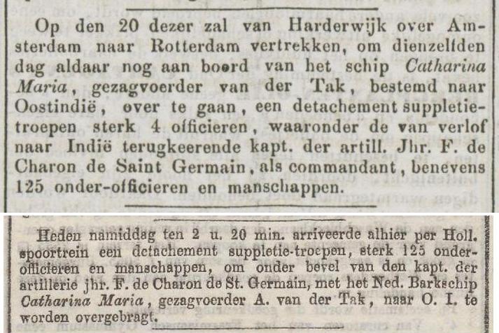 Berichten over het vertrek van De Charon de Saint Germain in het Dagblad van Zuid-Holland en 's-Gravenhage van 18 oktober en de Nieuwe Rotterdamsche Courant van 21 oktober 1859