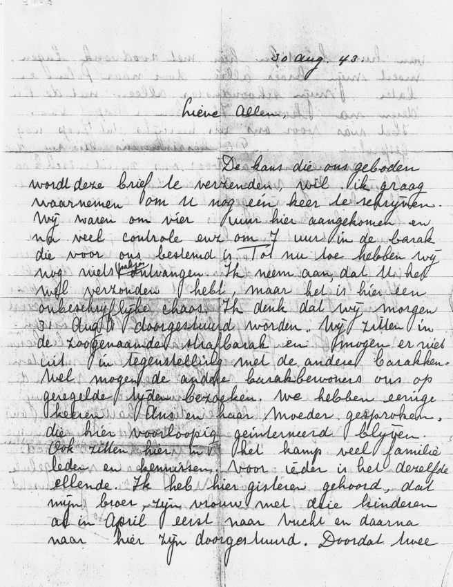 Sophia Cohens brief van 30 augustus 1943 uit het doorgangskamp Westerbork, voorkant. Bron http://www.joodsmonument.nl
