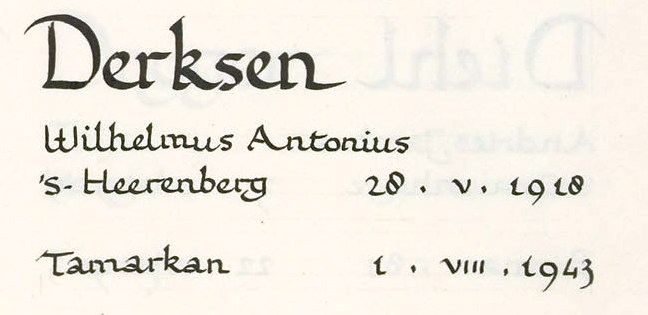 De vermelding van WA Derksen op blz. 43 van de Erelijst van gevallenen 1940-1945