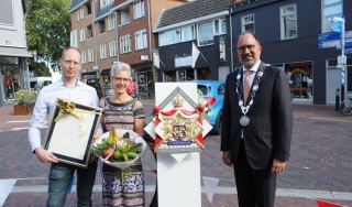 Henri Dijkman en Miriam Blom ontvangen uit handen van burgemeester De Baat het Hofleveranciersschild (Foto: Marlous Velthausz / Montferlandjournaal)