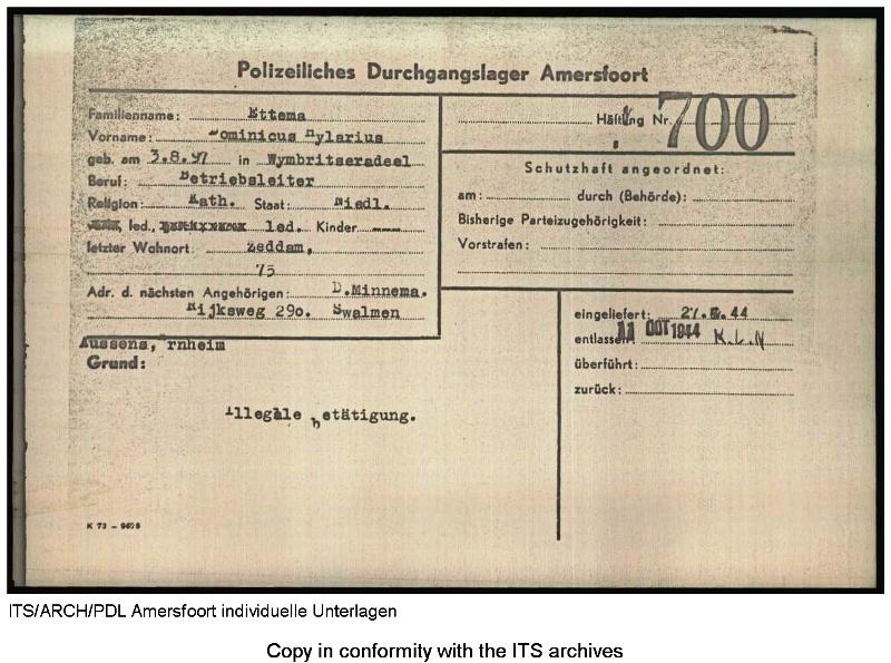 Ettema's stamkaart uit Kamp Amersfoort, bewaard in ITS-Arolsen. Beschikbaar gesteld door Annemiek Littlejohn van Stichting Hart voor Kamp Amersfoort.
