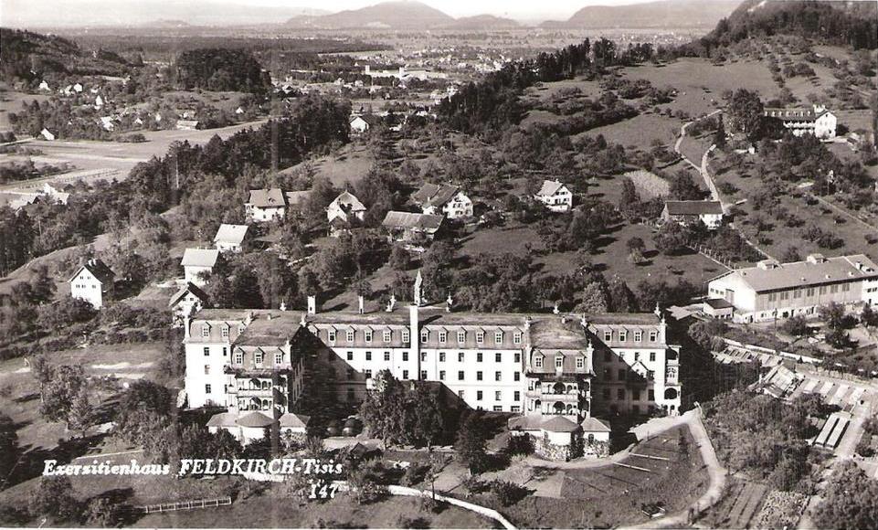 Het Exerzitienhaus in Tisis, Oostenrijk, diende als voorbeeld voor het patersklooster. Ansichtkaartuit ca. 1950