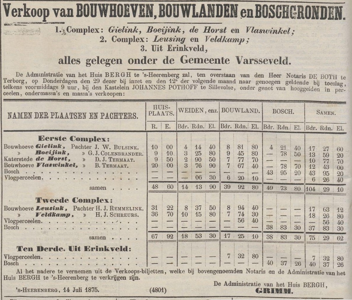 Aankondiging van de verkoop van grond van Huis Bergh in dagblad De Tijd van 17 juli 1875. De verkoop wordt uitgevoerd door notaris FXL de Both. De ondertekening is door adminstrateur Jospeh Grimm. Bron: http://kranten.kb.nl