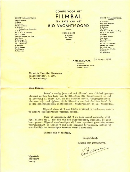 uitnodiging filmbal, opbrengst voor het bio vacantieoord 1936