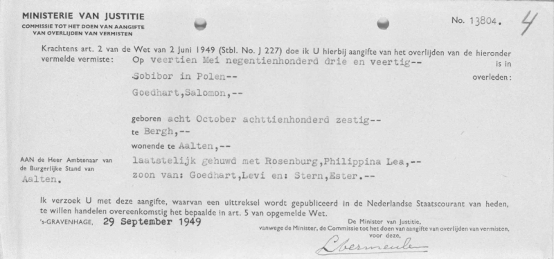 De officiële mededeling No. 13804 van de Commissie tot het doen van aangifte van overlijden van vermisten van Salomon Goedharts overlijden in Sobibor. Bron http://zoekakten.nl