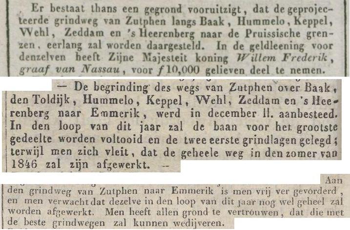 Nieuwsflitsen over de grindweg in de Arnhemsche Courant van 6 juli 1842 en 3 juli 1845, en de Nederlandsche Staatscourant van 8 juli 1846