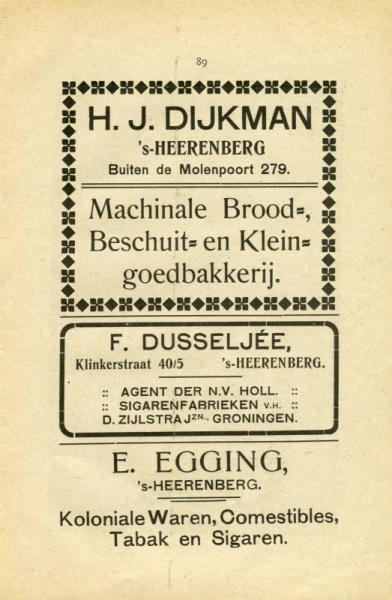 Dijkmann buiten de molenpoort, bakkerij. F Dusseljee klinkerstraat40/5.E.Egging kolonialewaren blz 89
