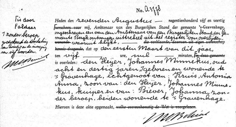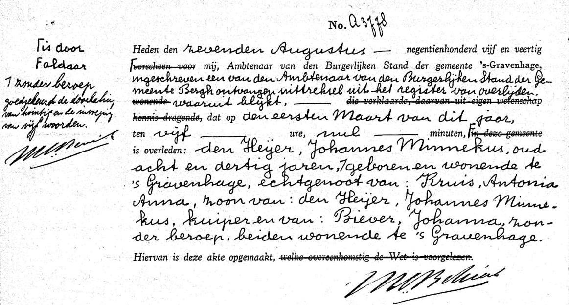 Overlijdensakte van JM den Heijer, opgemaakt op 7 augustus 1945 in Den Haag. Bron www.gemeentearchief.denhaag.nl