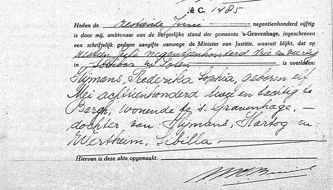 Overlijdensakte van Frederika Sophia Hijmans, opgemaakt op 16 juni 1950 in Den Haag. Bron www.gemeentearchief.denhaag.nl