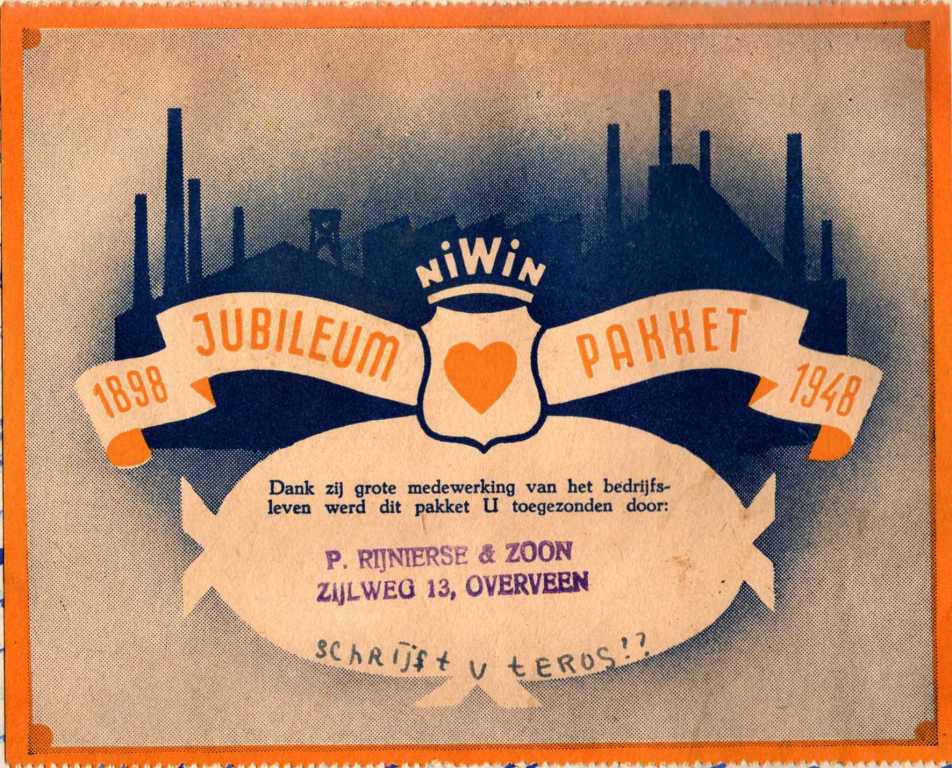 Het etiket van een NIWIN-jublieumpakket ter gelegenheid van het 50-jarig ambtsjubileum van koningin Wilhelmina, uit het dagboek van Joseph Berendsen