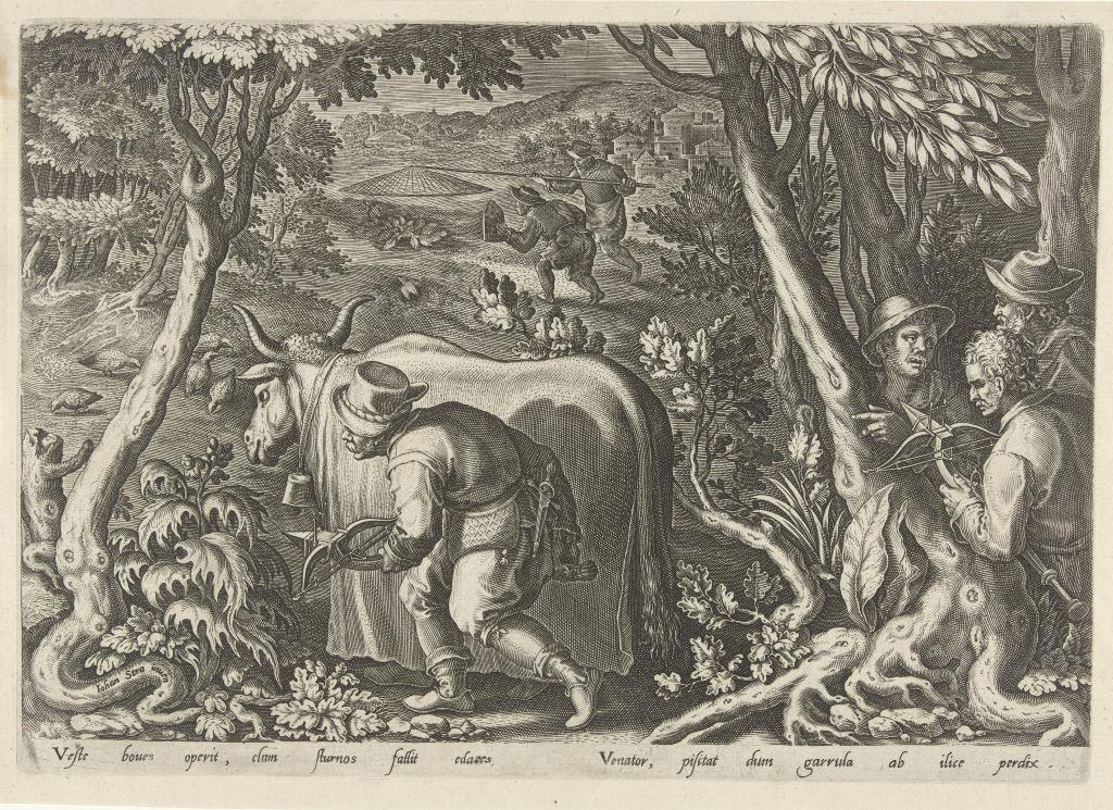 "Jacht op patrijzen" door Philips Galle naar een ontwerp van Jan van der Straet, Antwerpen 1578. Collectie Rijksmuseum Amsterdam, objectnummer RP-P-1891-A-16439