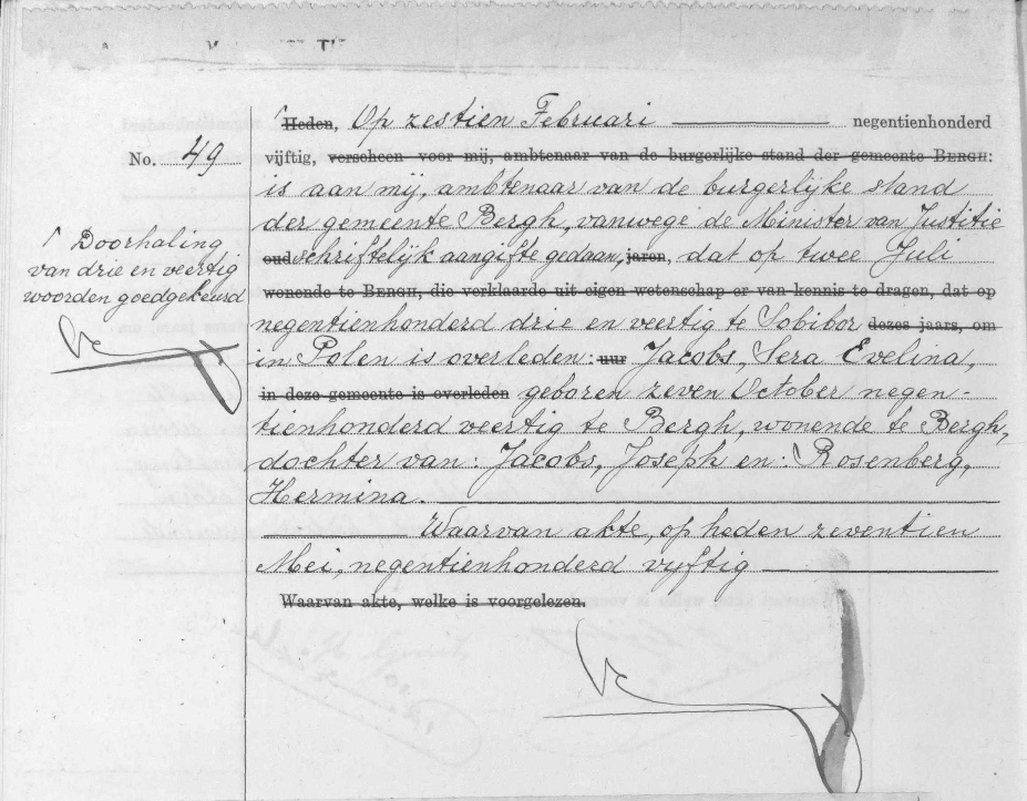 Sera Evelina Jacobs' overlijdensakte in de gemeente Bergh. Bron http://zoekakten.nl