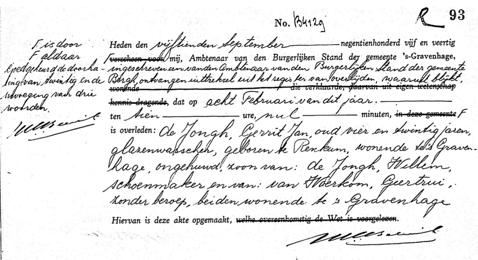 Overlijdensakte van GJ de Jongh, Den Haag, 15 september 1945. Bron www.gemeentearchief.denhaag.nl