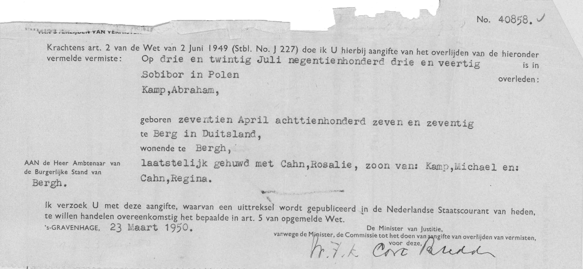 De officiële mededeling No. 40858 van de Commissie tot het doen van aangifte van overlijden van vermisten van Abraham Kamps overlijden in Auschwitz. Bron http://zoekakten.nl