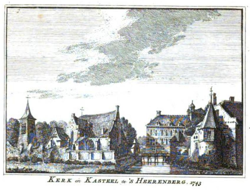 Gravure van de kerk en het kasteel in 's-Heerenberg door Jan de Beijer uit Het verheerlykt Nederland, of, Kabinet van hedendaagsche gezigten, in 1745 uitgegeven door de Amsterdamse boekhandelaar Isaak Tirion.