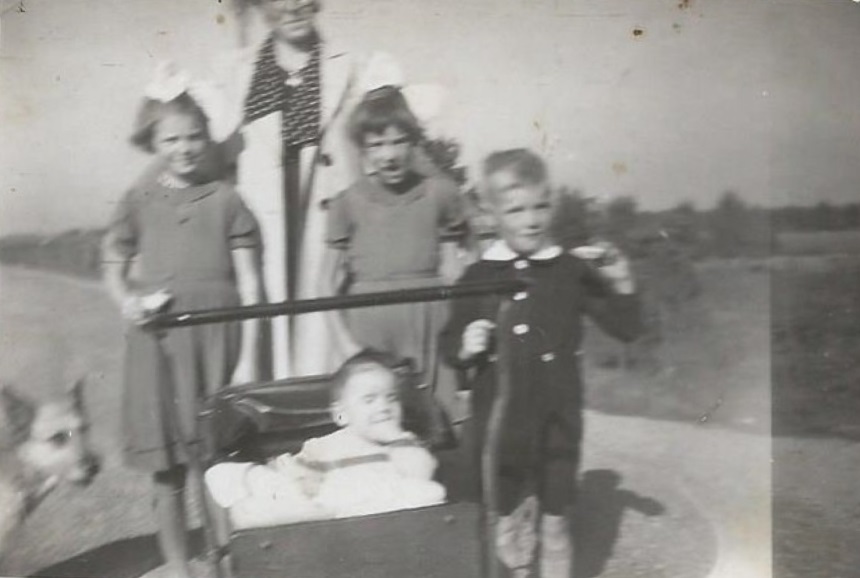 De kinderen van Hent en Lies van Eck: Hennie, Al, Gert en (in de wagen) Willy van Eck