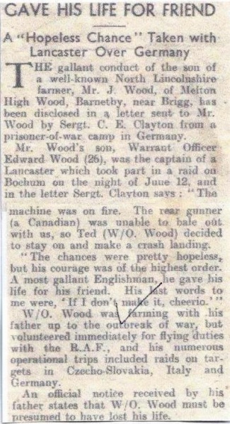 Knipsel uit een onbekende krant uit de nalatenschap van sergeant Clayton, boordwerktuigkundige van Lancaster ED558