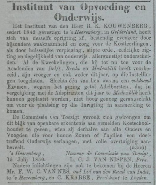 Advertentie voor Kouwenbergs kostschool in de NRC van 22 juli 1850. Bron http://kranten.kb.nl