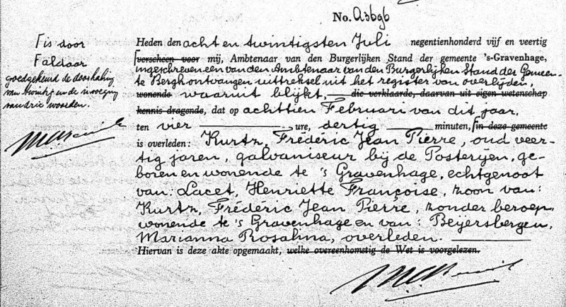 Overlijdensakte van FJP Kurtz, opgemaakt op 28 juli 1945 in Den Haag. Bron www.gemeentearchief.denhaag.nl