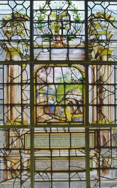 Het gebrandschilderde raam in het karmelietenklooster in Boxmeer geschonken door de Boxmeerse chirurgijn Jan Cool en zijn vrouw Anna van den Hoove. Bron: Rijksdienst voor het Cultureel Erfgoed, CC BY-SA 4.0, https://commons.wikimedia.org/w/index.php?curid=24045239