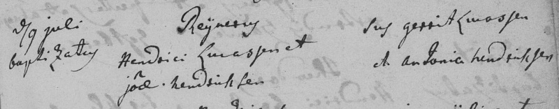 De inschrijving van Reijnerus Lucassens doop op 9 juli 1791 in het r.-k. doopregister van Wehl. Bron http://zoekakten.nl
