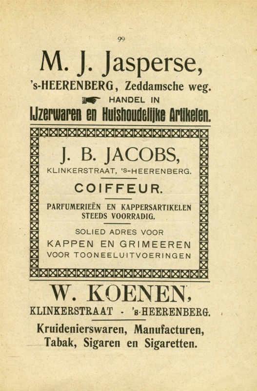 M.J. Jasperse, IJzerwaren en Huishoudelijkeartikelen. J.B. Jacobs klinkerstraat kapper. W. Koenen klinkerstraat kruidenierswaren en manufacturen.blz 99