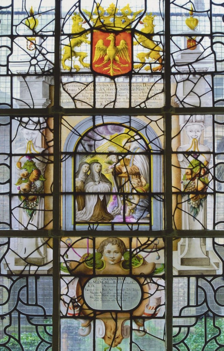 Het gebrandschilderde raam in het karmelietenklooster in Boxmeer geschonken door Madeleine de Cusance. Bron: Rijksdienst voor het Cultureel Erfgoed, CC BY-SA 4.0, https://commons.wikimedia.org/w/index.php?curid=24045223