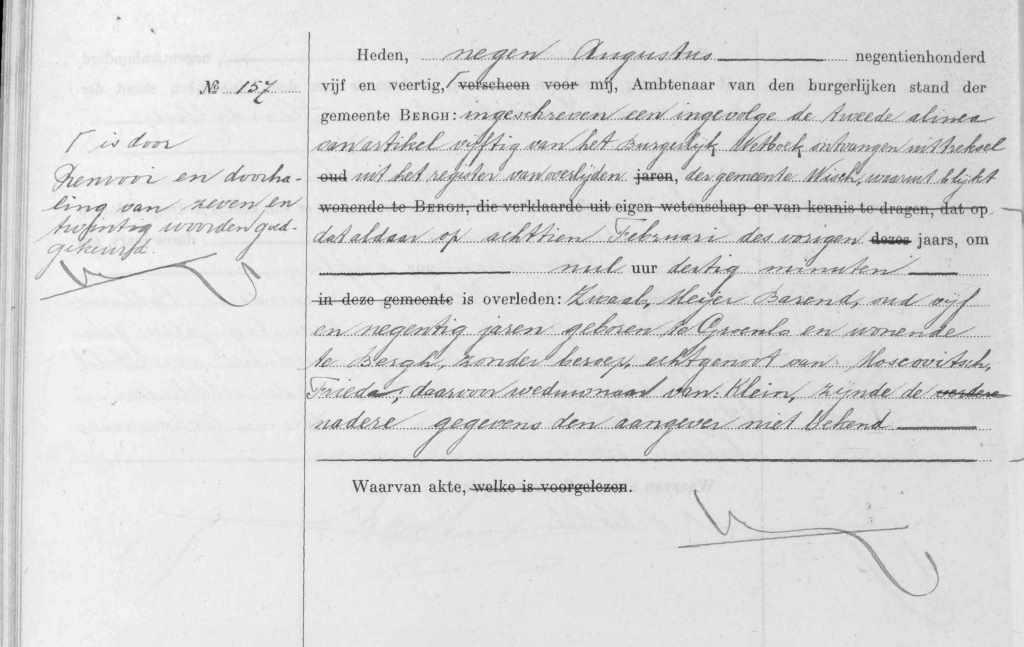 Overlijdensakte Meijer Zwaab in Bergh, 1945. Bron http://zoekakten.nl
