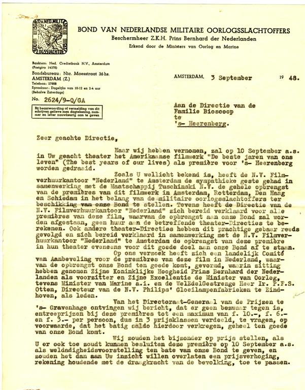 verzoek om een gedeelte van de bioscoop opbrengst te doneren voor de oorlogsslachtoffers brief 3 sept 1948