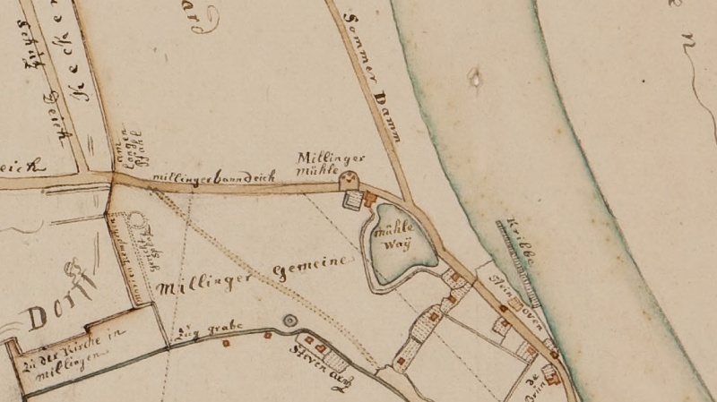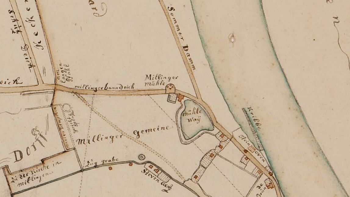 Detail van een kaart uit 1795 van de heerlijkheden Millingen en Zeeland, Gelders archief, archieftoegang 0016, inventarisnummer 35