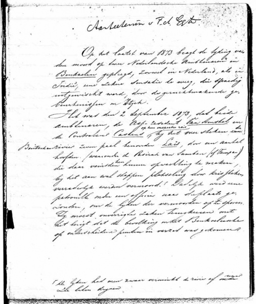 Bladzijde uit aantekeningen van A.J.F. Egter van Wissekerke betreffende de moord op J.H.Chr. Castens. Bron: Nederlands Instituut voor Militaire Historie, Den Haag, Egter van Wissekerke, Toegang 440, inv.nr. 18