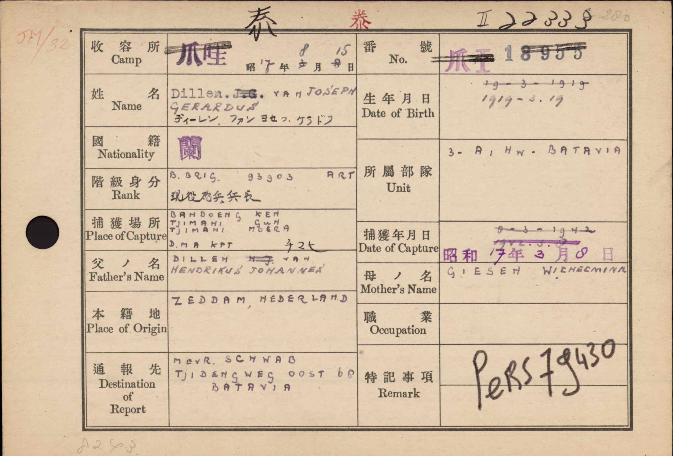 Japanse interneringskaarten, toegangsnummer toegang 2.10.50.03, inventarisnummer 425, interneringskaart Joep van Dillen