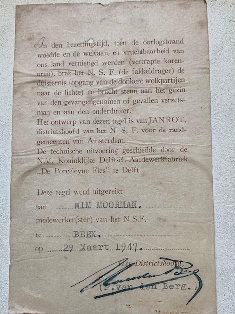 het etiket op de achterkant van Wim Moormans NSF-tegel