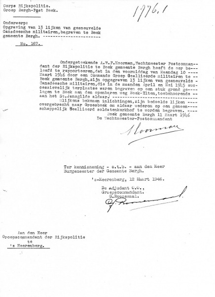 Het rapport dat Antoon Moorman op 11 maart 1946 maakte van de opgraving van dertien gesneuvelde Canadezen in Beek. GAB, archief 1942-1983, inventarisnummer 189