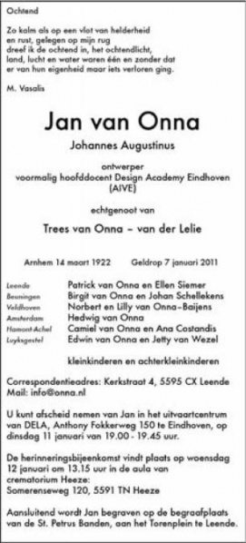 Overlijdensadvertentie Jan van Onna, 7 januari 2011