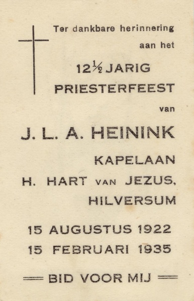 Herinnering aan het 12½-jarig priesterfeest van kapelaan Heinink. Bron: parochiearchief Azewijn