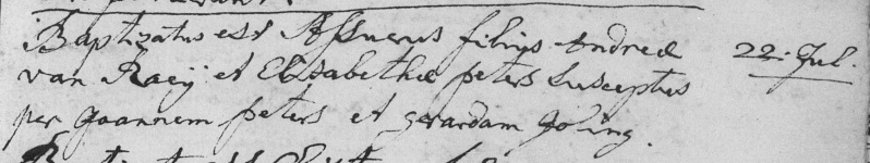 De inschrijving van de doop van Assuerus van Raaij op 22 juli 1789 in het r.-k. doopregister van Zeddam. Bron http://zoekakten.nl