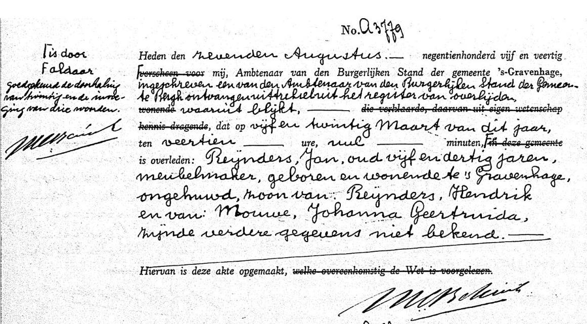 Overlijdensakte van J Reijnders, opgemaakt op 7 augustus 1945 in Den Haag. Bron www.gemeentearchief.denhaag.nl