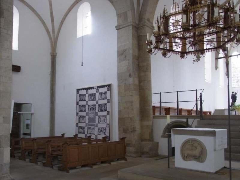 Replica van het Vredener hongerdoek in de stiftskerk van Vreden. Foto Marcel Messing