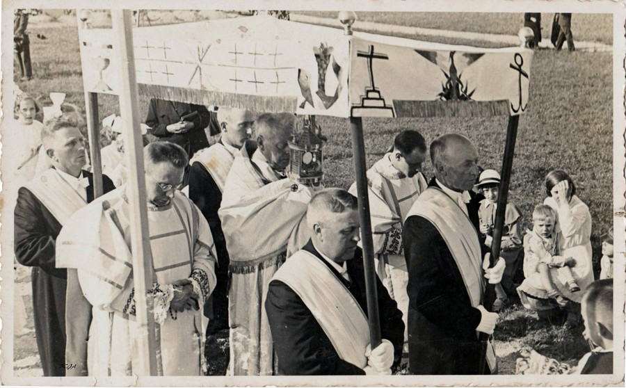 Kapelaan van Rooijen met naast hem de Monstrans in processie. Benny Schuurman
