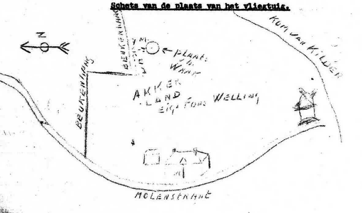 Situatieschets van het wrak van Gilferts vliegtuig uit het Rapport van Overbrenging uit 1951. GAB, archief 1942-1983, inventarisnummer 190