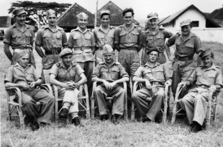 Compagniestaf van 4-5-6 RI in Malang, april 1950. Staande 1e van links Joop Egging, hulpfoerier. Foto in maart 2009 geleverd door Map de Lange, staande 2e van rechts, schijver-ordonnans.