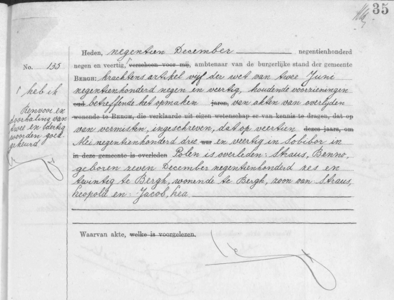 Benno Straus' overlijdensakte in de gemeente Bergh. Bron http://zoekakten.nl