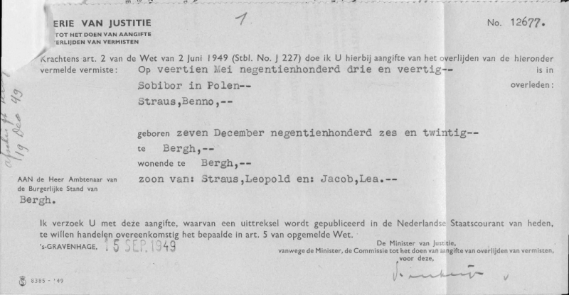 De officiële mededeling No. 12677 van de Commissie tot het doen van aangifte van overlijden van vermisten van Benno Straus' overlijden in Sobibor. Bron http://zoekakten.nl
