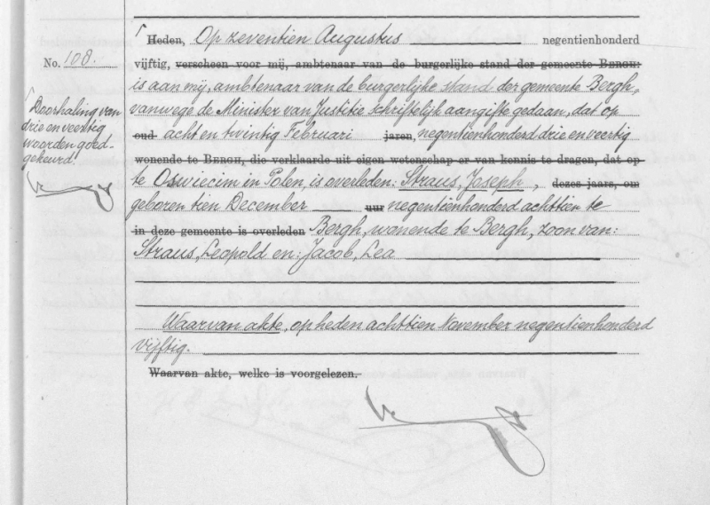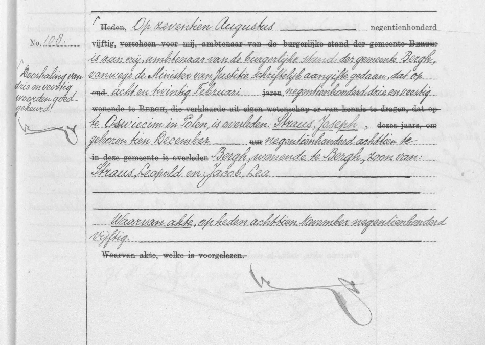 Joseph Straus' overlijdensakte in de gemeente Bergh. Bron http://zoekakten.nl